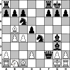 game notation in PGN-format [Event "Dann mal los"] [Site "www.myChess.de"] [Date "2006.09.24"] [Round "2"] [White "Mirikado23"] [Black "richym3"] [ECO "A00"] [WhitemyELO "1500"] [BlackmyELO "1516"] [Result "0-1"] [TimeControl "10/864000"] [WhiteDays "13"] [BlackDays "18"] [MyChessNo "28892"] 1. d3 e5 2. Nf3 Nc6 3. d4 exd4 4. Nxd4 Nf6 5. e4 Nxe4 6. Qd3 d5 7. Qe3 Bc5 8. Bb5 O-O 9. b4 Bxd4 10. Qh3 Bxh3 11. c3 Bxf2+ 12. Ke2 Bg4+ 13. Kf1 Qf6 14. c4 Bg3+ 15. Kg1 Qf2# 0-1 position notation in FEN-format r4rk1/ppp2ppp/2n5/1B1p4/1PP1n1b1/6b1/P2P1qPP/RNB3KR - - - 3 16 Captured white pieces: Captured black pieces: Click on a captured piece in order to display the desired move!