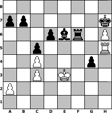 game notation in PGN-format [Event "Der HSF feiert 3.Geburtstag-feiert gern mit!"] [Site "www.myChess.de"] [Date "2013.05.01"] [Round "1"] [White "Rotstift10"] [Black "freizeitspieler"] [ECO "A52"] [WhitemyELO "1611"] [BlackmyELO "1552"] [Result "0-1"] [TimeControl "10/2592000"] [WhiteDays "28"] [BlackDays "30"] [MyChessNo "88111"] 1. d4 Nf6 2. c4 e5 3. dxe5 Ng4 4. Nf3 Nc6 5. Bf4 Bb4+ 6. Nc3 Qe7 7. Qd5 Bxc3+ 8. bxc3 Qa3 9. Qd2 Qc5 10. e3 Ngxe5 11. Bxe5 Nxe5 12. Qd5 Nxf3+ 13. gxf3 Qe7 14. Qd4 O-O 15. Rg1 f6 16. Bd3 c5 17. Qh4 g5 18. f4 Rf7 19. fxg5 Rg7 20. f4 Qxe3+ 21. Kf1 Qxd3+ 22. Kf2 d6 23. gxf6 Qd2+ 24. Kf1 Rxg1+ 25. Kxg1 Qd3 26. Qg5+ Qg6 27. Kf2 Bf5 28. h4 Re8 29. Rd1 Re6 30. Rg1 Kf7 31. h5 Qxg5 32. fxg5 Bd3 33. g6+ hxg6 34. Rg3 Rxf6+ 35. Ke3 Bf5 36. h6 Kg8 37. Rg1 Kh7 38. Rh1 Be6 39. Rh4 g5 40. Rh5 g4 0-1 position notation in FEN-format 8/pp5k/3pbr1P/2p4R/2P3p1/2P1K3/P7/8 - - - 0 41 Captured white pieces: ![]() ![]() ![]() ![]() ![]() ![]() ![]() ![]() ![]() ![]() ![]() ![]() ![]() ![]() ![]() Captured black pieces: ![]() ![]() ![]() ![]() ![]() ![]() ![]() ![]() ![]() ![]() ![]() ![]() ![]() ![]() ![]() Click on a captured piece in order to display the desired move!