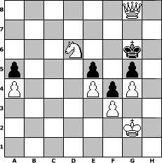 game notation in PGN-format [Event "Spa"] [Site "www.myChess.de"] [Date "2012.01.18"] [Round "1"] [White "wiesel"] [Black "augustus"] [ECO "D00"] [WhitemyELO "1233"] [BlackmyELO "1282"] [Result "1-0"] [TimeControl "10/2592000"] [WhiteDays "25"] [BlackDays "00"] [MyChessNo "79254"] 1. d4 d5 2. e3 Nf6 3. Nf3 c6 4. Nc3 Bg4 5. Be2 e6 6. O-O Bd6 7. g3 Nbd7 8. a3 c5 9. dxc5 Bxc5 10. b4 Bb6 11. Re1 Rc8 12. Nxd5 Nxd5 13. Bb2 f6 14. Bd4 O-O 15. Bb2 e5 16. Qxd5+ Kh8 17. Rad1 Rc7 18. Rd2 Bh3 19. Bb5 a6 20. Bd3 a5 21. b5 Qe7 22. a4 Nc5 23. Bc4 Be6 24. Qd6 Bxc4 25. Qxb6 Ra8 26. Red1 h6 27. Ba3 Be6 28. Rd6 Rac8 29. Bxc5 Rxc5 30. Nh4 Qc7 31. Rxe6 Qxb6 32. Rxb6 R8c7 33. Rd2 Kh7 34. Rd8 Rxc2 35. Re6 Rc8 36. Rd7 Rf8 37. Rxb7 Kg8 38. Nf5 Rf7 39. Rb8+ Kh7 40. Nh4 g5 41. Nf5 Kg6 42. g4 Kh7 43. Ree8 Rcc7 44. Rh8+ Kg6 45. Rbg8+ Rg7 46. Rf8 Rh7 47. Rhg8+ Rcg7 48. Nd6 h5 49. h3 hxg4 50. hxg4 Rh4 51. f3 Rh3 52. Kg2 Rhh7 53. b6 f5 54. b7 Rxg8 55. Rxg8+ Rg7 56. b8=Q f4 57. e4 Rxg8 58. Qxg8+ 1-0 position notation in FEN-format 6Q1/8/3N2k1/p3p1p1/P3PpP1/5P2/6K1/8 - - - 0 58 Captured white pieces: Captured black pieces: Click on a captured piece in order to display the desired move!