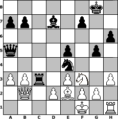 game notation in PGN-format [Event "ZEPPELIN-OPEN-2014-02"] [Site "www.myChess.de"] [Date "2014.10.13"] [Round "1"] [White "FrankB"] [Black "sabrina"] [ECO "D02"] [WhitemyELO "1739"] [BlackmyELO "1429"] [Result "1-0"] [TimeControl "10/3456000"] [WhiteDays "38"] [BlackDays "40"] [MyChessNo "96340"] 1. d4 d5 2. Nf3 Nf6 3. Bf4 Nc6 4. e3 e6 5. a3 Bd7 6. c4 dxc4 7. Bxc4 Bd6 8. Bg5 h6 9. Bh4 e5 10. Nc3 exd4 11. Nxd4 O-O 12. Ne4 g5 13. Nxd6 cxd6 14. Bg3 Ne5 15. Be2 Qb6 16. b3 Rac8 17. Rc1 Qa5+ 18. Kf1 Rxc1 19. Qxc1 Rc8 20. Qb2 Rc3 21. h3 Ne4 22. Bxe5 dxe5 23. Nf3 1-0 position notation in FEN-format 6k1/pp1b1p2/7p/q3p1p1/4n3/PPr1PN1P/1Q1PBPP1/5K1R - - - 1 23 Captured white pieces: Captured black pieces: Click on a captured piece in order to display the desired move!