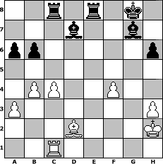 game notation in PGN-format [Event "Zwischendurch mal ein paar eigene Z"] [Site "www.myChess.de"] [Date "2009.06.25"] [Round "1"] [White "hape50"] [Black "Seneca"] [ECO "A41"] [WhitemyELO "1383"] [BlackmyELO "1400"] [Result "0-1"] [TimeControl "10/1728000"] [WhiteDays "80"] [BlackDays "59"] [MyChessNo "56941"] 1. d4 d6 2. e3 Nf6 3. h3 g6 4. Nf3 Bg7 5. c4 O-O 6. Bd3 Nbd7 7. Nc3 c5 8. O-O cxd4 9. exd4 a6 10. a3 e6 11. b4 b6 12. Ne4 Nxe4 13. Bxe4 Rb8 14. Ng5 Nf6 15. f4 h6 16. Nxf7 Kxf7 17. Qf3 Nxe4 18. Qxe4 Bb7 19. Qd3 Qe8 20. d5 Bxa1 21. Re1 Bc8 22. Bd2 Bg7 23. dxe6+ Bxe6 24. Qxd6 Qd7 25. Qxd7+ Bxd7 26. Rf1 Kg8 27. Kh2 g5 28. g3 gxf4 29. gxf4 Rbc8 30. Rc1 Rfe8 0-1 position notation in FEN-format 2r1r1k1/3b2b1/pp5p/8/1PP2P2/P6P/3B3K/2R5 - - - 3 31 Captured white pieces: Captured black pieces: Click on a captured piece in order to display the desired move!