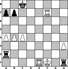 game notation in PGN-format [Event "unter uns Nr. 17"] [Site "www.myChess.de"] [Date "2014.02.13"] [Round "1"] [White "Caligula"] [Black "Knight"] [ECO "B01"] [WhitemyELO "1474"] [BlackmyELO "1233"] [Result "0-1"] [TimeControl "10/864000"] [WhiteDays "47"] [BlackDays "49"] [MyChessNo "92911"] 1. e4 d5 2. exd5 Nf6 3. c4 Bg4 4. Be2 Qd7 5. d3 Bxe2 6. Qxe2 c6 7. dxc6 Nxc6 8. Bg5 O-O-O 9. Bxf6 gxf6 10. Nf3 Bg7 11. Nc3 Qxd3 12. Qxd3 Rxd3 13. Rc1 Bh6 14. Rc2 Rhd8 15. O-O e5 16. h3 f5 17. a3 e4 18. Ne1 R3d4 19. b3 Bd2 20. Nb5 R4d7 21. Kh2 Bf4+ 22. g3 Be5 23. b4 Rg8 24. Nc3 Nd4 25. Rc1 h5 26. a4 h4 27. Rg1 hxg3+ 28. fxg3 Nf3+ 29. Nxf3 Bxc3 30. Rxc3 exf3 31. Rf1 Rd2+ 32. Kh1 Rxg3 33. Rcxf3 Rgg2 34. Re1 Rh2+ 35. Kg1 Rdg2+ 36. Kf1 Ra2 37. Kg1 Rhc2 38. Rxf5 Rg2+ 39. Kf1 Rh2 40. Rxf7 Rh1# 0-1 position notation in FEN-format 2k5/pp3R2/8/8/PPP5/7P/r7/4RK1r - - - 1 41 Captured white pieces: Captured black pieces: Click on a captured piece in order to display the desired move!