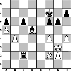 game notation in PGN-format [Event "Turnier der Stubenhocker Nr.1"] [Site "www.myChess.de"] [Date "2011.08.14"] [Round "1"] [White "Zwilling"] [Black "Caligula"] [ECO "D00"] [WhitemyELO "1481"] [BlackmyELO "1361"] [Result "0-1"] [TimeControl "10/1728000"] [WhiteDays "20"] [BlackDays "20"] [MyChessNo "75518"] 1. d4 d5 2. e3 Nf6 3. Nd2 e6 4. c4 Bb4 5. Bd3 c6 6. c5 Nbd7 7. a3 Ba5 8. b4 Bc7 9. Ngf3 b6 10. h3 a6 11. a4 O-O 12. Qc2 Re8 13. Ng5 g6 14. e4 dxe4 15. Ndxe4 e5 16. cxb6 Bxb6 17. dxe5 Nxe5 18. Nxf6+ Qxf6 19. O-O Nxd3 20. Qxd3 Qxa1 21. Be3 Qf6 22. Ne4 Qe5 23. Bxb6 Qxe4 24. Qxe4 Rxe4 25. Bc5 Be6 26. f3 Re2 27. Ra1 Re8 28. Kh2 Ra2 29. Rxa2 Bxa2 30. Kg3 Re2 31. f4 Rc2 32. a5 Bd5 33. Bf2 f6 34. h4 Kf7 0-1 position notation in FEN-format 8/5k1p/p1p2pp1/P2b4/1P3P1P/6K1/2r2BP1/8 - - - 1 35 Captured white pieces: Captured black pieces: Click on a captured piece in order to display the desired move!