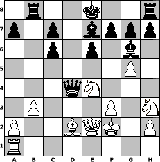 game notation in PGN-format [Event "Sommerturnier f"] [Site "www.myChess.de"] [Date "2009.08.14"] [Round "1"] [White "Knight"] [Black "leitsgeheier"] [ECO "D00"] [WhitemyELO "1187"] [BlackmyELO "1500"] [Result "0-1"] [TimeControl "10/1728000"] [WhiteDays "20"] [BlackDays "20"] [MyChessNo "58314"] 1. d4 d5 2. e4 dxe4 3. Nc3 Nf6 4. f3 Bf5 5. g4 Bg6 6. g5 Nd5 7. Nxe4 Nc6 8. Bb5 e6 9. Bd2 Be7 10. Bxc6+ bxc6 11. Qe2 Rb8 12. b3 Nb4 13. Nh3 Nxc2+ 14. Kf2 Nxa1 15. Rxa1 Qxd4+ 0-1 position notation in FEN-format 1r2k2r/p1p1bppp/2p1p1b1/6P1/3qN3/1P3P1N/P2BQK1P/R7 - k - 0 16 Captured white pieces: Captured black pieces: Click on a captured piece in order to display the desired move!