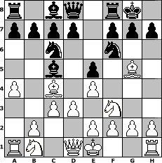 game notation in PGN-format [Event "Make myChess great again...."] [Site "www.myChess.de"] [Date "2017.02.11"] [Round "1"] [White "wolni55"] [Black "Knight"] [ECO "C55"] [WhitemyELO "1452"] [BlackmyELO "1170"] [Result "0-1"] [TimeControl "10/864000"] [WhiteDays "00"] [BlackDays "10"] [MyChessNo "106901"] 1. e4 e5 2. Nf3 Nc6 3. Bc4 Nf6 4. d3 Bc5 5. c3 O-O 6. a4 Ng4 7. Bg5 Nf6 0-1 position notation in FEN-format r1bq1rk1/pppp1ppp/2n2n2/2b1p1B1/P1B1P3/2PP1N2/1P2PPPP/RN1QK2R - KQ - 3 8 Captured white pieces: Captured black pieces: Click on a captured piece in order to display the desired move!