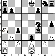 game notation in PGN-format [Event "Schach dem Nikolaus VII"] [Site "www.myChess.de"] [Date "2020.11.23"] [Round "1"] [White "boeserWatz"] [Black "Lohl"] [ECO "B00"] [WhitemyELO "1264"] [BlackmyELO "1789"] [Result "0-1"] [TimeControl "10/2592000"] [WhiteDays "30"] [BlackDays "29"] [MyChessNo "119998"] 1. e4 Nc6 2. d4 d5 3. e5 Bf5 4. Bd3 Nxd4 5. Bxf5 Nxf5 6. Nf3 e6 7. O-O c5 8. b3 Be7 9. Nc3 g5 10. Bd2 g4 11. Ne1 h5 12. Nd3 c4 13. Nf4 Qc7 14. h3 Qxe5 15. Re1 Qd4 16. Nb5 Qb6 17. Nc3 g3 18. Be3 d4 19. Na4 Qd6 20. Nxe6 dxe3 21. Qxd6 gxf2+ 22. Kf1 fxe1=Q+ 23. Kxe1 Bxd6 24. Nf4 Bxf4 0-1 position notation in FEN-format r3k1nr/pp3p2/8/5n1p/N1p2b2/1P2p2P/P1P1P1P1/R3K3 - kq - 0 25 Captured white pieces: Captured black pieces: Click on a captured piece in order to display the desired move!