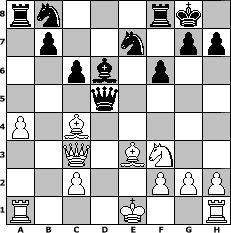 game notation in PGN-format [Event "Anderssen-Club-Meisterschaft"] [Site "www.myChess.de"] [Date "2006.04.11"] [Round "1"] [White "Hotze"] [Black "Matthias"] [ECO "A10"] [WhitemyELO "1467"] [BlackmyELO "1267"] [Result "1-0"] [TimeControl "10/864000"] [WhiteDays "10"] [BlackDays "10"] [MyChessNo "24419"] 1. c4 d5 2. cxd5 Qxd5 3. Nc3 Qc5 4. d4 Qb4 5. a3 Qa5 6. b4 Qb6 7. Nd5 Qc6 8. Qb3 e6 9. Nf4 Bd6 10. d5 exd5 11. Nxd5 Be6 12. e4 Ne7 13. b5 Qc5 14. Be3 Bxd5 15. exd5 Qxd5 16. Qc3 a6 17. a4 axb5 18. Bxb5+ c6 19. Bf1 f6 20. Nf3 O-O 21. Bc4 1-0 position notation in FEN-format rn3rk1/1p2n1pp/2pb1p2/3q4/P1B5/2Q1BN2/2P2PPP/R3K2R - KQ - 3 21 Captured white pieces: ![]() ![]() ![]() ![]() ![]() ![]() ![]() ![]() ![]() ![]() ![]() ![]() ![]() ![]() ![]() Captured black pieces: ![]() ![]() ![]() ![]() ![]() ![]() ![]() ![]() ![]() ![]() ![]() ![]() ![]() ![]() ![]() Click on a captured piece in order to display the desired move!