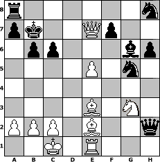 game notation in PGN-format [Event "960 f"] [Site "www.myChess.de"] [Date "2007.10.13"] [Round "1"] [White "muetoe"] [Black "Frankenstein"] [Variant "Fischerrandom"] [SetUp "1"] [FEN "rkrbqnbn/pppppppp/8/8/8/8/PPPPPPPP/RKRBQNBN w KQkq - 0 1"] [WhitemyELO "1821"] [BlackmyELO "1641"] [Result "1-0"] [TimeControl "10/3456000"] [WhiteDays "120"] [BlackDays "070"] [MyChessNo "38881"] 1. f4 e5 2. Qg3 Bf6 3. f5 d5 4. Nf2 Qc6 5. Ng4 Nd7 6. e4 dxe4 7. Nxf6 Qxf6 8. Qg4 h6 9. Ng3 Bh7 10. Qxe4 g6 11. Bf3 c6 12. fxg6 Bxg6 13. Qg4 Nf8 14. Bc5 Re8 15. Re1 Kc7 16. Qb4 b6 17. Be3 Ne6 18. Qa4 Ng5 19. Be2 Qd8 20. d4 Qd5 21. dxe5 Qxg2 22. O-O-O Qxh2 23. Rd7+ Kxd7 24. Qd4+ Kc7 25. Qd6+ Kb7 26. Qd7+ Kb8 27. Qxe8+ Kb7 28. Qe7+ 1-0 position notation in FEN-format r6n/pk2Qp2/1pp3bp/4P1n1/8/4B1N1/PPP1B2q/2K1R3 - - - 2 28 Captured white pieces: Captured black pieces: Click on a captured piece in order to display the desired move!