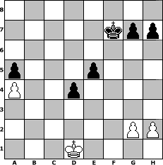 game notation in PGN-format [Event "Mannschaftsturnier der letzen Mohikan3er"] [Site "www.myChess.de"] [Date "2018.06.01"] [Round "1"] [White "Rotstift10"] [Black "pepo47"] [ECO "B10"] [WhitemyELO "1623"] [BlackmyELO "2099"] [Result "0-1"] [TimeControl "10/2592000"] [WhiteDays "113"] [BlackDays "117"] [MyChessNo "112287"] 1. e4 c6 2. Nf3 d5 3. exd5 cxd5 4. d4 Nf6 5. c4 e6 6. Qb3 Nc6 7. c5 b6 8. cxb6 Bb4+ 9. Bd2 Qxb6 10. Bxb4 Qxb4+ 11. Qxb4 Nxb4 12. Na3 Rb8 13. Bb5+ Bd7 14. Bxd7+ Kxd7 15. Ne5+ Ke7 16. O-O Rhc8 17. f3 Ne8 18. f4 f6 19. Ng4 Nc6 20. Nc2 Rxb2 21. Nge3 Nd6 22. a3 Na5 23. Nb4 Nb3 24. Rab1 Rxb1 25. Rxb1 Nxd4 26. Re1 Kf7 27. Kf1 a5 28. Na2 Nb3 29. Re2 d4 30. Nd1 Nc4 31. a4 Ncd2+ 32. Ke1 Rc2 33. Nc1 Rxc1 34. Rxd2 Nxd2 35. Kxd2 Rxd1+ 36. Kxd1 e5 37. fxe5 fxe5 0-1 position notation in FEN-format 8/5kpp/8/p3p3/P2p4/8/6PP/3K4 - - - 0 38 Captured white pieces: Captured black pieces: Click on a captured piece in order to display the desired move!