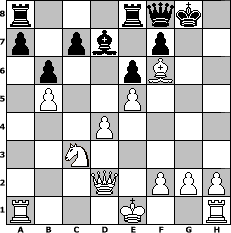 | game notation in PGN-format [Event "Zug um Zug gegen Fr"] [Site "www.myChess.de"] [Date "2010.05.04"] [Round "1"] [White "leitsgeheier"] [Black "Knight"] [ECO "E36"] [WhitemyELO "1577"] [BlackmyELO "1184"] [Result "1-0"] [TimeControl "10/2592000"] [WhiteDays "87"] [BlackDays "84"] [MyChessNo "65335"] 1. d4 Nf6 2. c4 e6 3. Nc3 Bb4 4. Qc2 d5 5. a3 Ba5 6. b4 Bxb4 7. axb4 dxc4 8. e4 O-O 9. Bxc4 Nc6 10. Nf3 Re8 11. Bb5 Bd7 12. Bxc6 Bxc6 13. b5 Bd7 14. Bg5 b6 15. e5 h6 16. Bh4 g5 17. Nxg5 hxg5 18. Bxg5 Qe7 19. Bxf6 Qf8 20. Qd2 1-0 position notation in FEN-format r3rqk1/p1pb1p2/1p2pB2/1P2P3/3P4/2N5/3Q1PPP/R3K2R - KQ - 2 20 Captured white pieces:                              Captured black pieces:                               Click on a captured piece in order to display the desired move!
