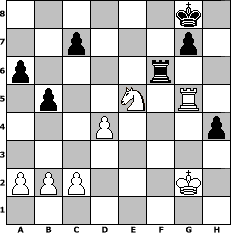 game notation in PGN-format [Event "Mal wieder spielen ?"] [Site "www.myChess.de"] [Date "2012.04.09"] [Round "1"] [White "Caligula"] [Black "Knight"] [ECO "C68"] [WhitemyELO "1345"] [BlackmyELO "1251"] [Result "1-0"] [TimeControl "10/2592000"] [WhiteDays "117"] [BlackDays "120"] [MyChessNo "81051"] 1. e4 e5 2. Nf3 Nc6 3. Bb5 a6 4. Bxc6 dxc6 5. Nxe5 Qd4 6. Ng4 Qxe4+ 7. Ne3 Nf6 8. O-O Bd6 9. Nc3 Qg6 10. h3 Bxh3 11. Qf3 Bd7 12. d3 O-O 13. Ne2 Bg4 14. Nf4 Bxf3 15. Nxg6 Bxg2 16. Kxg2 fxg6 17. Bd2 Nh5 18. Nc4 Bc5 19. Rae1 b5 20. Na5 Rae8 21. Nxc6 Rxe1 22. Bxe1 Nf4+ 23. Kh1 h5 24. Ne5 Rd8 25. Rg1 Rd6 26. Bd2 Bxf2 27. Rf1 Bg3 28. Bxf4 Bxf4 29. Rxf4 Re6 30. d4 g5 31. Rf5 Rf6 32. Rxg5 h4 33. Kg2 1-0 position notation in FEN-format 6k1/2p3p1/p4r2/1p2N1R1/3P3p/8/PPP3K1/8 - - - 1 33 Captured white pieces: ![]() ![]() ![]() ![]() ![]() ![]() ![]() ![]() ![]() ![]() ![]() ![]() ![]() ![]() ![]() Captured black pieces: ![]() ![]() ![]() ![]() ![]() ![]() ![]() ![]() ![]() ![]() ![]() ![]() ![]() ![]() ![]() Click on a captured piece in order to display the desired move!