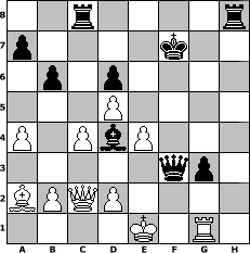 game notation in PGN-format [Event "7er2"] [Site "www.myChess.de"] [Date "2015.11.13"] [Round "1"] [White "Steffi"] [Black "atlantis"] [ECO "E61"] [WhitemyELO "1517"] [BlackmyELO "1504"] [Result "0-1"] [TimeControl "10/3456000"] [WhiteDays "179"] [BlackDays "157"] [MyChessNo "101215"] 1. d4 Nf6 2. c4 g6 3. Nc3 Bg7 4. Nf3 d6 5. e4 O-O 6. Bg5 h6 7. Bh4 Nbd7 8. Bd3 c6 9. O-O e5 10. d5 g5 11. Bg3 cxd5 12. exd5 Ne8 13. Rc1 f5 14. Bb1 f4 15. Qd3 Ndf6 16. Ne4 Nxe4 17. Qxe4 Nf6 18. Qc2 Bg4 19. h4 Bxf3 20. hxg5 hxg5 21. gxf3 Qe8 22. Kg2 e4 23. Bxf4 gxf4 24. Rh1 Qe5 25. Rcg1 Rae8 26. Kf1 Kf7 27. Rg2 Rg8 28. fxe4 Rh8 29. Rhg1 Bh6 30. f3 Nh5 31. Qb3 b6 32. a4 Ng3+ 33. Kf2 Qd4+ 34. Ke1 Rc8 35. Ba2 Bg7 36. Qc2 Qe3+ 37. Kd1 Qxf3+ 38. Ke1 Bd4 39. Rxg3 fxg3 0-1 position notation in FEN-format 2r4r/p4k2/1p1p4/3P4/P1PbP3/5qp1/BPQP4/4K1R1 - - - 0 40 Captured white pieces: Captured black pieces: Click on a captured piece in order to display the desired move!
