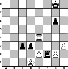 game notation in PGN-format [Event "Wrixum - Open die XII"] [Site "www.myChess.de"] [Date "2014.10.09"] [Round "1"] [White "UPS"] [Black "espero"] [ECO "B06"] [WhitemyELO "1650"] [BlackmyELO "1764"] [Result "0-1"] [TimeControl "10/2592000"] [WhiteDays "35"] [BlackDays "86"] [MyChessNo "96317"] 1. e4 g6 2. d4 Bg7 3. Nf3 c6 4. c3 d5 5. e5 f6 6. Bf4 Nh6 7. Qd2 Nf7 8. Bd3 Bg4 9. Qe3 O-O 10. Nbd2 fxe5 11. dxe5 Qb6 12. Qxb6 axb6 13. h3 Bxf3 14. Nxf3 Nd7 15. e6 Nc5 16. exf7+ Rxf7 17. Bxg6 hxg6 18. Bc1 Nb3 19. Rb1 Rxa2 20. O-O e5 21. Rd1 Nxc1 22. Rdxc1 e4 23. Ne1 b5 24. Nc2 c5 25. Rd1 Rd7 26. Kf1 Bxc3 27. bxc3 Rxc2 28. Rxb5 Rxc3 29. Rdb1 d4 30. Rxb7 Rxb7 31. Rxb7 d3 32. Ke1 c4 33. Re7 Rc1+ 34. Kd2 Rc2+ 35. Kd1 Rxf2 36. Rxe4 c3 0-1 position notation in FEN-format 6k1/8/6p1/8/4R3/2pp3P/4PrP1/3K4 - - - 0 37 Captured white pieces: Captured black pieces: Click on a captured piece in order to display the desired move!