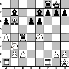 game notation in PGN-format [Event "Sizialianisch"] [Site "www.myChess.de"] [Date "2007.06.22"] [Round "1"] [White "Joschi"] [Black "Mike"] [ECO "B90"] [WhitemyELO "1621"] [BlackmyELO "1480"] [Result "1-0"] [TimeControl "10/864000"] [WhiteDays "09"] [BlackDays "00"] [MyChessNo "35855"] 1. e4 c5 2. Nf3 d6 3. d4 cxd4 4. Nxd4 Nf6 5. Nc3 a6 6. a4 b6 7. Bc4 Bb7 8. f3 e6 9. O-O Qc7 10. Bb3 Be7 11. Be3 Nbd7 12. Kh1 O-O 13. Qe2 Nc5 14. Bc4 Rac8 15. Nb3 Ncxe4 16. fxe4 Qxc4 17. Qxc4 Rxc4 18. Bxb6 Nxe4 19. Nxe4 1-0 position notation in FEN-format 5rk1/1b2bppp/pB1pp3/8/P1r1N3/1N6/1PP3PP/R4R1K - - - 0 19 Captured white pieces: ![]() ![]() ![]() ![]() ![]() ![]() ![]() ![]() ![]() ![]() ![]() ![]() ![]() ![]() ![]() Captured black pieces: ![]() ![]() ![]() ![]() ![]() ![]() ![]() ![]() ![]() ![]() ![]() ![]() ![]() ![]() ![]() Click on a captured piece in order to display the desired move!