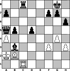 game notation in PGN-format [Event "Albspiele 15"] [Site "www.myChess.de"] [Date "2011.08.25"] [Round "1"] [White "Caligula"] [Black "reisender"] [Variant "Fischerrandom"] [SetUp "1"] [FEN "rnqknbbr/pppppppp/8/8/8/8/PPPPPPPP/RNQKNBBR w KQkq - 0 1"] [WhitemyELO "1358"] [BlackmyELO "1413"] [Result "0-1"] [TimeControl "10/1728000"] [WhiteDays "20"] [BlackDays "20"] [MyChessNo "75745"] 1. d4 d5 2. Nf3 e6 3. Nc3 Bb4 4. Qd2 Nc6 5. a3 Bxc3 6. Qxc3 Nd6 7. Qe3 h6 8. Ne5 Bh7 9. f3 O-O 10. g4 Nxe5 11. Qxe5 Nc4 12. Qf4 Nxb2+ 13. Kc1 Nc4 14. e4 e5 15. dxe5 Nb6 16. exd5 Nxd5 17. Qc4 c6 18. Qb3 Qd7 19. Kb2 Qe6 20. Bd4 b6 21. Bc4 b5 22. Bxd5 cxd5 23. Ka2 Rfc8 24. h3 Rxc2+ 25. Bb2 Qxe5 26. Rhe1 Qc7 27. Rec1 Rc8 28. a4 Qa5 29. Rxc2 Bxc2 30. Rc1 Bxb3+ 0-1 position notation in FEN-format 2r3k1/p4pp1/7p/qp1p4/P5P1/1b3P1P/KB6/2R5 - - - 0 31 Captured white pieces: Captured black pieces: Click on a captured piece in order to display the desired move!