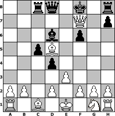 game notation in PGN-format [Event "Netzwerk Vulkaneifel"] [Site "www.myChess.de"] [Date "2021.11.05"] [Round "2"] [White "hsvler"] [Black "Haneken"] [ECO "D20"] [WhitemyELO "1397"] [BlackmyELO "1086"] [Result "1-0"] [TimeControl "10/1728000"] [WhiteDays "19"] [BlackDays "19"] [MyChessNo "123418"] 1. d4 d5 2. c4 dxc4 3. Nc3 e6 4. e3 b5 5. Nxb5 c6 6. Qf3 Bb7 7. Nc3 c5 8. Qxb7 Nd7 9. Bxc4 e5 10. Nd5 Bd6 11. Bb5 Rb8 12. Bxd7+ Kf8 13. Qxa7 Nf6 14. Nxf6 gxf6 15. Bc6 Rc8 16. Bd5 exd4 17. Qxf7# 1-0 position notation in FEN-format 2rq1k1r/5Q1p/3b1p2/2pB4/3p4/4P3/PP1P1PPP/R1B1K1NR - KQ - 0 17 Captured white pieces: Captured black pieces: Click on a captured piece in order to display the desired move!