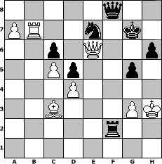 game notation in PGN-format [Event "Katalanisch II"] [Site "www.myChess.de"] [Date "2012.11.15"] [Round "1"] [White "muellerh"] [Black "Seneca"] [ECO "E00"] [WhitemyELO "1548"] [BlackmyELO "1531"] [Result "1-0"] [TimeControl "10/1728000"] [WhiteDays "097"] [BlackDays "107"] [MyChessNo "85021"] 1. d4 Nf6 2. c4 e6 3. g3 d5 4. c5 Be7 5. Bg2 c6 6. Nf3 O-O 7. O-O b6 8. b4 b5 9. Nc3 Nbd7 10. Re1 a5 11. bxa5 Qxa5 12. Bd2 Qd8 13. e4 b4 14. Na4 Nxe4 15. Bxb4 Ba6 16. Nd2 Nxd2 17. Qxd2 Bc4 18. Nc3 Qb8 19. Reb1 Qd8 20. a4 Nf6 21. Bf1 Bxf1 22. Kxf1 Ng4 23. h3 Bg5 24. Qe2 Nh6 25. h4 Be7 26. a5 Nf5 27. Rd1 Bf6 28. Qg4 Rb8 29. Rab1 g6 30. h5 Ng7 31. hxg6 fxg6 32. Ne2 Rf7 33. Nf4 Qd7 34. Bc3 Rxb1 35. Rxb1 Qc8 36. Re1 Re7 37. Kg2 Kf7 38. Rh1 Qg8 39. Nh3 Nf5 40. Ng5+ Bxg5 41. Qxg5 Qg7 42. Qf4 g5 43. Qf3 Kg8 44. Rb1 h6 45. Rb6 Rf7 46. Qe2 Ne7 47. Qxe6 Kh7 48. a6 Qf8 49. Rb7 Kg7 50. a7 Rxf2+ 51. Kh3 1-0 position notation in FEN-format 5q2/PR2n1k1/2p1Q2p/2Pp2p1/3P4/2B3PK/5r2/8 - - - 1 51 Captured white pieces: Captured black pieces: Click on a captured piece in order to display the desired move!