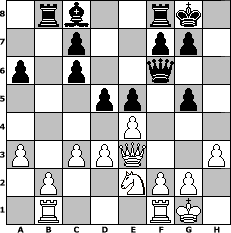 game notation in PGN-format [Event "Vierspringerspiel"] [Site "www.myChess.de"] [Date "2008.10.27"] [Round "2"] [White "OwainGwynedd"] [Black "Schmalte"] [ECO "C49"] [WhitemyELO "1481"] [BlackmyELO "1468"] [Result "0-1"] [TimeControl "10/2592000"] [WhiteDays "00"] [BlackDays "22"] [MyChessNo "49193"] 1. e4 e5 2. Nf3 Nc6 3. Nc3 Nf6 4. Bb5 Bb4 5. O-O O-O 6. d3 d6 7. Ne2 a6 8. Bxc6 bxc6 9. a3 Bc5 10. h3 h6 11. Bd2 Nh7 12. Qc1 Qf6 13. c3 d5 14. Be3 Bxe3 15. Qxe3 Rb8 16. Rab1 Ng5 17. Nxg5 hxg5 0-1 position notation in FEN-format 1rb2rk1/2p2pp1/p1p2q2/3pp1p1/4P3/P1PPQ2P/1P2NPP1/1R3RK1 - - - 0 18 Captured white pieces: Captured black pieces: Click on a captured piece in order to display the desired move!