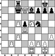game notation in PGN-format [Event "Die letzten Sommertage!!! Teil2"] [Site "www.myChess.de"] [Date "2009.09.14"] [Round "1"] [White "HenrySchinasky"] [Black "reisinger"] [ECO "C09"] [WhitemyELO "2106"] [BlackmyELO "1535"] [Result "1-0"] [TimeControl "10/864000"] [WhiteDays "29"] [BlackDays "28"] [MyChessNo "59025"] 1. e4 e6 2. d4 d5 3. Nd2 c5 4. exd5 exd5 5. Ngf3 Nc6 6. Bb5 Bd7 7. O-O Nf6 8. Re1+ Be7 9. dxc5 O-O 10. Nb3 a6 11. Bxc6 Bxc6 12. Ne5 Ba4 13. Qd4 Bxb3 14. axb3 Qc7 15. b4 a5 16. Bf4 axb4 17. Nd3 Qd7 18. Qxb4 b5 19. Be5 Ng4 20. Bd4 Ra4 21. Rxa4 bxa4 22. h3 Nh6 23. Ne5 Qc7 24. Qxa4 Nf5 25. c3 Rc8 26. Qd7 1-0 position notation in FEN-format 2r3k1/2qQbppp/8/2PpNn2/3B4/2P4P/1P2PPP1/4R1K1 - - - 2 26 Captured white pieces: ![]() ![]() ![]() ![]() ![]() ![]() ![]() ![]() ![]() ![]() ![]() ![]() ![]() ![]() ![]() Captured black pieces: ![]() ![]() ![]() ![]() ![]() ![]() ![]() ![]() ![]() ![]() ![]() ![]() ![]() ![]() ![]() Click on a captured piece in order to display the desired move!