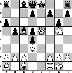 game notation in PGN-format [Event "YOUR LAST BREATH"] [Site "www.myChess.de"] [Date "2019.11.17"] [Round "2"] [White "augustus"] [Black "martinus"] [ECO "B20"] [WhitemyELO "1155"] [BlackmyELO "1718"] [Result "1-0"] [TimeControl "10/3456000"] [WhiteDays "40"] [BlackDays "40"] [MyChessNo "116392"] 1. e4 c5 2. Bc4 e6 3. Nf3 Nf6 4. Nc3 a6 5. d4 b5 6. Be2 Nc6 7. e5 Nd5 8. Nxd5 exd5 9. O-O cxd4 10. Ng5 Bc5 11. Bd3 Nxe5 12. Qe2 g6 13. Qxe5+ 1-0 position notation in FEN-format r1bqk2r/3p1p1p/p5p1/1pbpQ1N1/3p4/3B4/PPP2PPP/R1B2RK1 - kq - 0 13 Captured white pieces: Captured black pieces: Click on a captured piece in order to display the desired move!