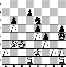 game notation in PGN-format [Event "Tigran (Wartanowitsch)Petrosjan Turnier"] [Site "www.myChess.de"] [Date "2009.08.09"] [Round "1"] [White "martinus"] [Black "Hobbykegler"] [ECO "B27"] [WhitemyELO "1834"] [BlackmyELO "1093"] [Result "1-0"] [TimeControl "10/2592000"] [WhiteDays "119"] [BlackDays "116"] [MyChessNo "58165"] 1. e4 c5 2. Nf3 b6 3. d4 cxd4 4. Nxd4 e5 5. Nb5 Nc6 6. Bc4 Nf6 7. Bg5 h6 8. Bxf6 Qxf6 9. Nc7+ Kd8 10. Nxa8 Bc5 11. f3 Nd4 12. c3 Nc6 13. b4 Be3 14. Qd3 Bf4 15. Bd5 Bb7 16. b5 Na5 17. Bxb7 Nxb7 18. Na3 Ke7 19. Nc7 Qh4+ 20. Ke2 Nc5 21. Nd5+ Kd8 22. Qc2 Rf8 23. Nxf4 exf4 24. Nc4 g5 25. Ne5 Ne6 26. Qd2 Nc5 27. Qd6 g4 28. Qxf8+ Kc7 29. Nxg4 h5 30. Ne5 Ne6 31. Qa8 f6 32. Qxa7+ Kd6 33. Qb8+ Kc5 34. Rad1 fxe5 35. Qd6+ Kc4 36. Qd5+ Kxc3 37. Qb3# 1-0 position notation in FEN-format 8/3p4/1p2n3/1P2p2p/4Pp1q/1Qk2P2/P3K1PP/3R3R - - - 1 37 Captured white pieces: Captured black pieces: Click on a captured piece in order to display the desired move!