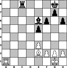 game notation in PGN-format [Event "4. Norderstedter DENK MAL Open 2013"] [Site "www.myChess.de"] [Date "2013.01.09"] [Round "1"] [White "FrankB"] [Black "sprinterde"] [ECO "A40"] [WhitemyELO "1518"] [BlackmyELO "1686"] [Result "1/2-1/2"] [TimeControl "10/2592000"] [WhiteDays "30"] [BlackDays "30"] [MyChessNo "86077"] 1. d4 e6 2. c4 Nf6 3. Nf3 Bb4+ 4. Bd2 c5 5. dxc5 Bxc5 6. e3 Qb6 7. Qc2 Nc6 8. a3 O-O 9. b4 Be7 10. Nc3 d5 11. Na4 Qc7 12. Bc3 Rd8 13. Be2 Ne4 14. Bb2 Nxb4 15. axb4 Bxb4+ 16. Nc3 b5 17. O-O Nxc3 18. Bxc3 Bxc3 19. Qxc3 dxc4 20. Nd4 Rb8 21. Rfc1 e5 22. Nxb5 Rxb5 23. Qxc4 Qxc4 24. Rxc4 Rb7 25. Rca4 Rb2 26. Bc4 Rbd2 27. Rxa7 Be6 28. Bf1 f6 29. Ra8 h6 30. Rxd8+ Rxd8 31. Be2 Rc8 1/2-1/2 position notation in FEN-format 2r3k1/6p1/4bp1p/4p3/8/4P3/4BPPP/R5K1 - - - 2 32 Captured white pieces: Captured black pieces: Click on a captured piece in order to display the desired move!