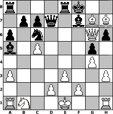game notation in PGN-format [Event "XII. Klub-Meisterschaft -Die Wikinger-"] [Site "www.myChess.de"] [Date "2016.05.01"] [Round "2"] [White "Hobbykegler"] [Black "Haneken"] [ECO "A20"] [WhitemyELO "1003"] [BlackmyELO "1122"] [Result "1-0"] [TimeControl "10/2592000"] [WhiteDays "28"] [BlackDays "30"] [MyChessNo "103523"] 1. c4 e5 2. b3 Bb4 3. Bb2 Nf6 4. Qc2 d6 5. a3 Ba5 6. b4 Bb6 7. h3 O-O 8. c5 dxc5 9. bxc5 Ba5 10. Bxe5 Nc6 11. Bb2 Re8 12. g4 g5 13. Nf3 h6 14. e3 Ne4 15. Bd3 Be6 16. Bxe4 a6 17. Bh7+ Kf8 18. Ne5 Bd5 19. Nxf7 Qd7 20. Qg6 Bxf7 21. Bg7+ 1-0 position notation in FEN-format r3rk2/1ppq1bBB/p1n3Qp/b1P3p1/6P1/P3P2P/3P1P2/RN2K2R - KQ - 1 21 Captured white pieces: Captured black pieces: Click on a captured piece in order to display the desired move!
