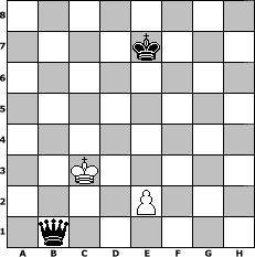 game notation in PGN-format [Event "M"] [Site "www.myChess.de"] [Date "2013.02.24"] [Round "1"] [White "Joschi"] [Black "Teresa"] [ECO "C78"] [WhitemyELO "1596"] [BlackmyELO "1544"] [Result "0-1"] [TimeControl "10/3456000"] [WhiteDays "40"] [BlackDays "40"] [MyChessNo "86740"] 1. e4 e5 2. Nf3 Nc6 3. Bb5 a6 4. Ba4 Nf6 5. O-O b5 6. Bb3 Nxe4 7. d4 d5 8. dxe5 Be6 9. Bf4 g5 10. Bg3 h5 11. h3 g4 12. Nd4 Nxd4 13. Qxd4 h4 14. Bf4 gxh3 15. gxh3 c5 16. Qe3 f5 17. c3 Rg8+ 18. Kh1 c4 19. Bc2 Bc5 20. Qf3 d4 21. cxd4 Bxd4 22. Nc3 Nxc3 23. bxc3 Bd5 24. cxd4 Bxf3+ 25. Kh2 Qxd4 26. Be3 Qxe3 27. fxe3 Rg2+ 28. Kh1 Rg3+ 29. Kh2 Ke7 30. Bxf5 Rg2+ 31. Kh1 Rxa2+ 32. Kg1 Rg8+ 33. Bg4 Bxg4 34. hxg4 Rxg4+ 35. Kh1 Rxa1 36. Rxa1 c3 37. Rxa6 h3 38. Rc6 b4 39. Kh2 Re4 40. Kxh3 Rxe5 41. Kg4 Rxe3 42. Kf4 Rh3 43. Ke4 b3 44. Kd4 b2 45. Rxc3 Rxc3 46. Kxc3 b1=Q 0-1 position notation in FEN-format 8/4k3/8/8/8/2K5/4P3/1q6 - - - 0 47 Captured white pieces: ![]() ![]() ![]() ![]() ![]() ![]() ![]() ![]() ![]() ![]() ![]() ![]() ![]() ![]() ![]() Captured black pieces: ![]() ![]() ![]() ![]() ![]() ![]() ![]() ![]() ![]() ![]() ![]() ![]() ![]() ![]() ![]() Click on a captured piece in order to display the desired move!