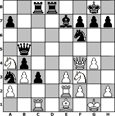 game notation in PGN-format [Event "Schneeturnier"] [Site "www.myChess.de"] [Date "2010.02.08"] [Round "1"] [White "RashimIbenRohal"] [Black "Grubengeist"] [ECO "D10"] [WhitemyELO "1512"] [BlackmyELO "1905"] [Result "0-1"] [TimeControl "10/2592000"] [WhiteDays "78"] [BlackDays "54"] [MyChessNo "63082"] 1. d4 d5 2. c4 c6 3. e3 Nf6 4. Nc3 e6 5. Nf3 Nbd7 6. Bd3 dxc4 7. Bxc4 b5 8. Bb3 b4 9. Na4 Ba6 10. Qc2 Rc8 11. Bc4 Bxc4 12. Qxc4 Be7 13. Bd2 Qa5 14. b3 Ne4 15. O-O O-O 16. Rfc1 c5 17. d5 exd5 18. Qxd5 Ndf6 19. Qc4 Rfd8 20. Rc2 Nd6 21. Qf4 c4 22. Rac1 c3 23. Be1 Nb5 24. g4 Na3 25. Re2 Qb5 0-1 position notation in FEN-format 2rr2k1/p3bppp/5n2/1q6/Np3QP1/nPp1PN2/P3RP1P/2R1B1K1 - - - 3 26 Captured white pieces: Captured black pieces: Click on a captured piece in order to display the desired move!