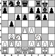 game notation in PGN-format [Event "Februar 2017"] [Site "www.myChess.de"] [Date "2017.02.05"] [Round "1"] [White "Joschi"] [Black "Seneca"] [ECO "B08"] [WhitemyELO "1577"] [BlackmyELO "1526"] [Result "1-0"] [TimeControl "10/1728000"] [WhiteDays "20"] [BlackDays "00"] [MyChessNo "106785"] 1. e4 d6 2. d4 Nf6 3. Nc3 g6 4. Nf3 Bg7 5. Bc4 O-O 6. O-O c6 7. Re1 b5 8. Bb3 1-0 position notation in FEN-format rnbq1rk1/p3ppbp/2pp1np1/1p6/3PP3/1BN2N2/PPP1PPPP/R1BQR1K1 - - - 1 8 Captured white pieces: Captured black pieces: Click on a captured piece in order to display the desired move!