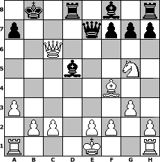 game notation in PGN-format [Event "Sommerpause"] [Site "www.myChess.de"] [Date "2011.06.29"] [Round "1"] [White "Duschgel"] [Black "werderfan"] [ECO "A20"] [WhitemyELO "1586"] [BlackmyELO "1526"] [Result "1-0"] [TimeControl "10/864000"] [WhiteDays "10"] [BlackDays "08"] [MyChessNo "74743"] 1. c4 e5 2. g3 d5 3. Bg2 c6 4. cxd5 cxd5 5. Qb3 Nf6 6. Nc3 e4 7. d3 exd3 8. Nxd5 Nxd5 9. Bxd5 Qe7 10. Qxd3 Nc6 11. a3 Bd7 12. Nf3 O-O-O 13. Qc3 Kb8 14. Ng5 Be6 15. Bxc6 bxc6 16. Qxc6 Bd5 17. Bf4+ 1-0 position notation in FEN-format 1k1r1b1r/p3qppp/2Q5/3b2N1/5B2/P5P1/1PP1PP1P/R3K2R - KQ - 2 17 Captured white pieces: Captured black pieces: Click on a captured piece in order to display the desired move!
