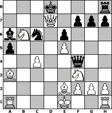 game notation in PGN-format [Event "Schnell ins neue Jahr"] [Site "www.myChess.de"] [Date "2013.01.01"] [Round "1"] [White "Joschi"] [Black "Haneken"] [ECO "B02"] [WhitemyELO "1563"] [BlackmyELO "1532"] [Result "1-0"] [TimeControl "10/864000"] [WhiteDays "10"] [BlackDays "09"] [MyChessNo "85850"] 1. e4 Nf6 2. e5 Nd5 3. c4 Nb4 4. d4 e6 5. a3 N4a6 6. b4 Be7 7. b5 Nb4 8. axb4 Bxb4+ 9. Bd2 a5 10. Bxb4 b6 11. Ba3 Qg5 12. Nf3 Qf4 13. Bd3 c6 14. Nc3 cxb5 15. Nxb5 Nc6 16. Nc7+ Kd8 17. Nxa8 Nxd4 18. Nxb6 Ba6 19. Be2 Nc6 20. Qxd7# 1-0 position notation in FEN-format 3k3r/3Q1ppp/bNn1p3/p3P3/2P2q2/B4N2/4BPPP/R3K2R - KQ - 0 20 Captured white pieces: Captured black pieces: Click on a captured piece in order to display the desired move!
