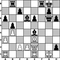 game notation in PGN-format [Event "Turnier zum Tag der deutschen Einheit"] [Site "www.myChess.de"] [Date "2010.10.04"] [Round "2"] [White "Knight"] [Black "hape50"] [ECO "D00"] [WhitemyELO "1183"] [BlackmyELO "1341"] [Result "0-1"] [TimeControl "10/1728000"] [WhiteDays "60"] [BlackDays "60"] [MyChessNo "68794"] 1. d4 d5 2. e4 dxe4 3. Nc3 a6 4. Nxe4 e6 5. Nf3 h6 6. Be2 Nf6 7. Nxf6+ Qxf6 8. O-O Nc6 9. Re1 Be7 10. Be3 b5 11. Bd3 Bb7 12. Be4 Rb8 13. Bxc6+ Bxc6 14. a3 Be4 15. Ne5 Bd6 16. Nc6 Qg6 17. f3 Bxc6 18. d5 Bxd5 19. g4 O-O 20. b3 f5 21. Qe2 fxg4 22. Qg2 Bxf3 23. Qf2 Be4 24. Qe2 g3 25. b4 gxh2# 0-1 position notation in FEN-format 1r3rk1/2p3p1/p2bp1qp/1p6/1P2b3/P3B3/2PPQ2p/R3R1K1 - - - 0 26 Captured white pieces: Captured black pieces: Click on a captured piece in order to display the desired move!