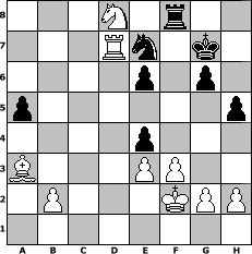 game notation in PGN-format [Event "November-Open 1/6"] [Site "www.myChess.de"] [Date "2007.11.05"] [Round "1"] [White "Phantasos"] [Black "zoli"] [ECO "D02"] [WhitemyELO "2124"] [BlackmyELO "1651"] [Result "1-0"] [TimeControl "10/1728000"] [WhiteDays "14"] [BlackDays "08"] [MyChessNo "39459"] 1. d4 d5 2. Nf3 Nf6 3. c4 Nc6 4. Nc3 e6 5. e3 Bb4 6. Bd2 O-O 7. Bd3 dxc4 8. Bxc4 Bd6 9. O-O a6 10. Re1 Re8 11. a3 e5 12. Ng5 Rf8 13. d5 Ne7 14. Nge4 Ne8 15. f3 b5 16. Bb3 Rb8 17. Qc2 Bf5 18. Rec1 Rc8 19. Qd3 c6 20. dxc6 Rxc6 21. a4 Bxe4 22. Nxe4 Rxc1+ 23. Rxc1 bxa4 24. Bxa4 Bc7 25. Qxd8 Bxd8 26. Bb4 h6 27. Kf2 a5 28. Ba3 h5 29. Rd1 Nc7 30. Bb3 g6 31. Rd7 Ne6 32. Nd6 Kg7 33. Bxe6 fxe6 34. Nb7 e4 35. Nxd8 1-0 position notation in FEN-format 3N1r2/3Rn1k1/4p1p1/p6p/4p3/B3PP2/1P3KPP/8 - - - 0 35 Captured white pieces: ![]() ![]() ![]() ![]() ![]() ![]() ![]() ![]() ![]() ![]() ![]() ![]() ![]() ![]() ![]() Captured black pieces: ![]() ![]() ![]() ![]() ![]() ![]() ![]() ![]() ![]() ![]() ![]() ![]() ![]() ![]() ![]() Click on a captured piece in order to display the desired move!