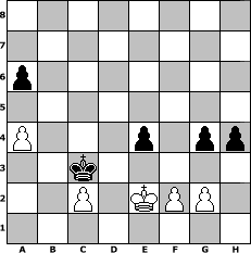game notation in PGN-format [Event "Zum 2.J"] [Site "www.myChess.de"] [Date "2005.06.22"] [Round "2"] [White "UPS"] [Black "kingcrusher"] [ECO "A00"] [WhitemyELO "1629"] [BlackmyELO "1960"] [Result "0-1"] [TimeControl "10/2592000"] [WhiteDays "017"] [BlackDays "136"] [MyChessNo "14361"] 1. Nc3 e5 2. e4 Nf6 3. d3 Bb4 4. Bd2 c5 5. Be2 Nc6 6. Nf3 h6 7. a3 Ba5 8. O-O O-O 9. h3 Re8 10. Nh2 Nd4 11. Rb1 d5 12. Nxd5 Nxd5 13. exd5 Bxd2 14. Qxd2 Qxd5 15. Bf3 Nxf3+ 16. Nxf3 Bxh3 17. Rfe1 Bg4 18. Nh2 Bh5 19. b3 e4 20. Re3 Bg6 21. Rbe1 Rad8 22. Qe2 f5 23. dxe4 Rxe4 24. Rxe4 fxe4 25. Nf1 a6 26. Ne3 Qd2 27. Qxd2 Rxd2 28. Rd1 Rxd1+ 29. Nxd1 Kf7 30. Kf1 Ke6 31. Ke1 Ke5 32. Kd2 Bh5 33. Ne3 b5 34. Kc3 Bf7 35. Nd1 c4 36. bxc4 Bxc4 37. Ne3 h5 38. Nxc4+ bxc4 39. Kxc4 g5 40. Kc3 h4 41. Kd2 g4 42. Ke2 Kd4 43. a4 Kc3 0-1 position notation in FEN-format 8/8/p7/8/P3p1pp/2k5/2P1KPP1/8 - - - 1 44 Captured white pieces: ![]() ![]() ![]() ![]() ![]() ![]() ![]() ![]() ![]() ![]() ![]() ![]() ![]() ![]() ![]() Captured black pieces: ![]() ![]() ![]() ![]() ![]() ![]() ![]() ![]() ![]() ![]() ![]() ![]() ![]() ![]() ![]() Click on a captured piece in order to display the desired move!