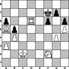 game notation in PGN-format [Event "Adventturnier"] [Site "www.myChess.de"] [Date "2021.11.16"] [Round "1"] [White "Mynona"] [Black "Master1"] [ECO "A50"] [WhitemyELO "1385"] [BlackmyELO "1278"] [Result "1-0"] [TimeControl "10/1728000"] [WhiteDays "20"] [BlackDays "20"] [MyChessNo "123579"] 1. d4 Nf6 2. c4 d5 3. c5 Nc6 4. Bf4 Bf5 5. e3 a6 6. a3 e6 7. h3 Be7 8. g4 Be4 9. f3 Bg6 10. h4 h6 11. h5 Bh7 12. Nc3 O-O 13. Nh3 Re8 14. b4 Nd7 15. Bd3 Bxd3 16. Qxd3 Bf6 17. O-O-O b6 18. Bg3 b5 19. Rdf1 e5 20. Nxd5 exd4 21. e4 Nce5 22. Qxd4 Nxf3 23. Nxf6+ Nxf6 24. Qxd8 Raxd8 25. Rxf3 Nxe4 26. Bxc7 Rd7 27. Bb6 Nf6 28. c6 Rd6 29. Rc3 Nd5 30. Bc5 Nxc3 31. Bxd6 Ne2+ 32. Kd2 Nd4 33. c7 Ne6 34. Re1 Nxc7 35. Bxc7 Rc8 36. Ba5 Rc6 37. Nf2 Rd6+ 38. Kc2 f6 39. Rd1 Kf7 40. Rxd6 1-0 position notation in FEN-format 8/5kp1/p2R1p1p/Bp5P/1P4P1/P7/2K2N2/8 - - - 0 40 Captured white pieces: ![]() ![]() ![]() ![]() ![]() ![]() ![]() ![]() ![]() ![]() ![]() ![]() ![]() ![]() ![]() Captured black pieces: ![]() ![]() ![]() ![]() ![]() ![]() ![]() ![]() ![]() ![]() ![]() ![]() ![]() ![]() ![]() Click on a captured piece in order to display the desired move!