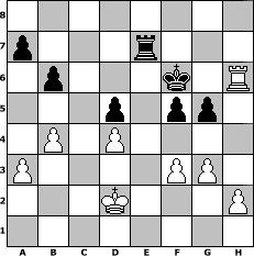 game notation in PGN-format [Event "Sommersonne "] [Site "www.myChess.de"] [Date "2016.05.14"] [Round "1"] [White "UPS"] [Black "reisinger"] [ECO "C41"] [WhitemyELO "1640"] [BlackmyELO "1515"] [Result "1-0"] [TimeControl "10/2592000"] [WhiteDays "106"] [BlackDays "150"] [MyChessNo "103630"] 1. e4 e5 2. Nf3 d6 3. d4 Nf6 4. dxe5 Nxe4 5. exd6 Bxd6 6. Bd3 Nc5 7. Qe2+ Be6 8. O-O O-O 9. Ng5 Nxd3 10. Qxd3 g6 11. Nc3 Bf5 12. Nge4 Qh4 13. g3 Qe7 14. Re1 Nc6 15. a3 Ne5 16. Nd5 Nxd3 17. Nxe7+ Bxe7 18. cxd3 Rad8 19. Bf4 c6 20. Rad1 Rd5 21. Nc3 Rd7 22. Rxe7 Rxe7 23. Bd6 Rd7 24. Bxf8 Kxf8 25. d4 Bc2 26. Rd2 Bb3 27. Ne4 Re7 28. f3 Bd5 29. Nf6 Kg7 30. Nxd5 cxd5 31. Kf2 f5 32. Rc2 b6 33. b4 h5 34. Rc6 Rd7 35. Ke3 g5 36. Re6 Kf7 37. Rh6 Kg7 38. Rxh5 Re7+ 39. Kd2 Kg6 40. Rh8 Kf6 41. Rh6+ 1-0 position notation in FEN-format 8/p3r3/1p3k1R/3p1pp1/1P1P4/P4PP1/3K3P/8 - - - 6 41 Captured white pieces: Captured black pieces: Click on a captured piece in order to display the desired move!