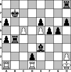 game notation in PGN-format [Event "Freibier f"] [Site "www.myChess.de"] [Date "2007.09.17"] [Round "1"] [White "Knight"] [Black "PeterLoskarn"] [ECO "A45"] [WhitemyELO "1311"] [BlackmyELO "2060"] [Result "0-1"] [TimeControl "10/864000"] [WhiteDays "38"] [BlackDays "39"] [MyChessNo "38256"] 1. d4 Nf6 2. g4 Nxg4 3. e4 d5 4. Be2 Nf6 5. e5 Nfd7 6. Nc3 e6 7. Nf3 c5 8. Bg5 Qa5 9. Qd3 Nc6 10. O-O a6 11. Kh1 cxd4 12. Nd1 Nc5 13. Qd2 Qxd2 14. Nxd2 Nxe5 15. f4 Nc6 16. Bg4 Ne4 17. Nxe4 dxe4 18. c3 f5 19. Bh3 d3 20. Ne3 Bc5 21. Nc4 b5 22. Ne5 Nxe5 23. fxe5 h6 24. Bh4 g5 25. Be1 Bb7 26. b4 Ba7 27. Bg2 O-O-O 28. Bd2 e3 29. Bxb7+ Kxb7 30. Bxe3 Bxe3 31. a4 bxa4 32. c4 d2 33. Rfd1 Rd4 34. c5 Rxb4 0-1 position notation in FEN-format 7r/1k6/p3p2p/2P1Ppp1/pr6/4b3/3p3P/R2R3K - - - 0 35 Captured white pieces: Captured black pieces: Click on a captured piece in order to display the desired move!