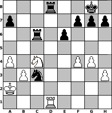 game notation in PGN-format [Event "Kellertunier"] [Site "www.myChess.de"] [Date "2005.08.15"] [Round "2"] [White "thello"] [Black "tuergeist"] [ECO "D10"] [WhitemyELO "1394"] [BlackmyELO "1264"] [Result "0-1"] [TimeControl "10/864000"] [WhiteDays "10"] [BlackDays "09"] [MyChessNo "16265"] 1. d4 d5 2. c4 c6 3. Nc3 dxc4 4. d5 cxd5 5. Qxd5 Qxd5 6. Nxd5 Na6 7. e4 e6 8. Ne3 Bb4+ 9. Bd2 b5 10. Bxb4 Nxb4 11. a3 Nd3+ 12. Bxd3 cxd3 13. O-O-O Bb7 14. Rxd3 Rc8+ 15. Kb1 Bxe4 16. Nf3 Bxd3+ 17. Ka2 Bc4+ 18. Nxc4 bxc4 19. Rc1 Ne7 20. Ne5 O-O 21. Nxc4 Rc6 22. b3 Rfc8 23. f4 Nf5 24. g4 Ne3 25. h3 Rd8 26. a4 Nd5 27. Rd1 Nc3+ 0-1 position notation in FEN-format 3r2k1/p4ppp/2r1p3/8/P1N2PP1/1Pn4P/K7/3R4 - - - 3 28 Captured white pieces: ![]() ![]() ![]() ![]() ![]() ![]() ![]() ![]() ![]() ![]() ![]() ![]() ![]() ![]() ![]() Captured black pieces: ![]() ![]() ![]() ![]() ![]() ![]() ![]() ![]() ![]() ![]() ![]() ![]() ![]() ![]() ![]() Click on a captured piece in order to display the desired move!