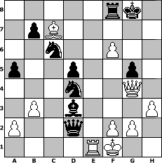 game notation in PGN-format [Event "5. Wikinger-Meisterschaft, Vorrunde B"] [Site "www.myChess.de"] [Date "2009.03.19"] [Round "1"] [White "Caligula"] [Black "Haneken"] [ECO "B02"] [WhitemyELO "1274"] [BlackmyELO "1550"] [Result "0-1"] [TimeControl "10/2592000"] [WhiteDays "120"] [BlackDays "111"] [MyChessNo "54030"] 1. e4 Nf6 2. Nc3 Nc6 3. Nf3 e6 4. e5 Ng4 5. d4 Bb4 6. Bd2 Bxc3 7. Bxc3 O-O 8. h3 Nh6 9. Bd2 Nf5 10. Bg5 Qe8 11. c3 d5 12. c4 Bd7 13. cxd5 exd5 14. Be2 h6 15. Bf4 g5 16. Bh2 Qe7 17. O-O Qb4 18. b3 Nfxd4 19. Bd3 Rae8 20. Re1 Re7 21. Nxg5 hxg5 22. Qh5 f6 23. Kf1 Qc3 24. Rad1 Be8 25. Qg4 a5 26. exf6 Rxe1+ 27. Rxe1 Qxd3+ 28. Kg1 Qd2 29. Kf1 Bg6 30. Bxc7 Bd3+ 0-1 position notation in FEN-format 5rk1/1pB5/2n2P2/p2p2p1/3n2Q1/1P1b3P/P2q1PP1/4RK2 - - - 1 31 Captured white pieces: Captured black pieces: Click on a captured piece in order to display the desired move!