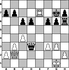 | game notation in PGN-format [Event "Mail"] [Site "www.myChess.de"] [Date "2012.05.01"] [Round "1"] [White "alpacino"] [Black "fred521"] [ECO "C65"] [WhitemyELO "1304"] [BlackmyELO "1313"] [Result "1-0"] [TimeControl "10/864000"] [WhiteDays "09"] [BlackDays "09"] [MyChessNo "81384"] 1. e4 e5 2. Nf3 Nc6 3. Bb5 Nf6 4. Bxc6 dxc6 5. Nxe5 Be6 6. O-O Nxe4 7. d3 Ng5 8. Bxg5 Qxg5 9. Nf3 Qh6 10. Nbd2 Bd6 11. Ne4 Bf4 12. g3 Bd6 13. Nd4 O-O 14. Nxd6 cxd6 15. Ne2 Bd5 16. Nf4 Rfe8 17. c4 Be6 18. Nxe6 Rxe6 19. Re1 Rae8 20. Rxe6 Rxe6 21. b3 Qh3 22. Qf3 Rh6 23. Qg2 Qf5 24. Re1 g6 25. f3 Qxd3 26. Re8+ Kg7 27. Qb2+ f6 28. Re7+ 1-0 position notation in FEN-format 8/pp2R1kp/2pp1ppr/8/2P5/1P1q1PP1/PQ5P/6K1 - - - 1 28 Captured white pieces:                              Captured black pieces:                               Click on a captured piece in order to display the desired move!