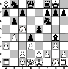 game notation in PGN-format [Event "Schachmatt unter Palmen"] [Site "www.myChess.de"] [Date "2009.07.13"] [Round "1"] [White "reisender"] [Black "Steppenwolf"] [ECO "A22"] [WhitemyELO "1353"] [BlackmyELO "1198"] [Result "1-0"] [TimeControl "10/864000"] [WhiteDays "10"] [BlackDays "10"] [MyChessNo "57395"] 1. c4 e5 2. Nc3 Nf6 3. g3 d5 4. b3 d4 5. Na4 Bb4 6. Bg2 O-O 7. a3 Ba5 8. b4 Bb6 9. c5 Bxc5 10. Nxc5 Bg4 11. d3 b6 12. Bxa8 1-0 position notation in FEN-format Bn1q1rk1/p1p2ppp/1p3n2/2N1p3/1P1p2b1/P2P2P1/2P1PP1P/R1BQK1NR - KQ - 0 12 Captured white pieces: ![]() ![]() ![]() ![]() ![]() ![]() ![]() ![]() ![]() ![]() ![]() ![]() ![]() ![]() ![]() Captured black pieces: ![]() ![]() ![]() ![]() ![]() ![]() ![]() ![]() ![]() ![]() ![]() ![]() ![]() ![]() ![]() Click on a captured piece in order to display the desired move!