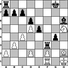 game notation in PGN-format [Event "Sommersonne "] [Site "www.myChess.de"] [Date "2016.05.14"] [Round "1"] [White "Steffi"] [Black "martinus"] [ECO "A53"] [WhitemyELO "1551"] [BlackmyELO "1781"] [Result "0-1"] [TimeControl "10/2592000"] [WhiteDays "057"] [BlackDays "119"] [MyChessNo "103646"] 1. d4 Nf6 2. c4 d6 3. Nc3 g6 4. e4 Bg7 5. Nf3 O-O 6. Bd3 Bg4 7. h3 Bxf3 8. Qxf3 Nc6 9. Be3 e5 10. d5 Nb4 11. Bg5 Nxd3+ 12. Qxd3 h6 13. Bh4 g5 14. Bg3 Nh5 15. O-O Qd7 16. b3 f5 17. Rae1 f4 18. Bh2 f3 19. Qd1 g4 20. h4 fxg2 21. Kxg2 Nf4+ 22. Kh1 h5 23. Ne2 Ng6 24. Ng3 Nxh4 25. Nxh5 Nf3 26. Re3 Bh6 27. Rd3 Qh7 28. Rxf3 Qxe4 29. Qd3 Qxf3+ 30. Qxf3 Rxf3 0-1 position notation in FEN-format r5k1/ppp5/3p3b/3Pp2N/2P3p1/1P3r2/P2P1P1B/5R1K - - - 0 31 Captured white pieces: Captured black pieces: Click on a captured piece in order to display the desired move!