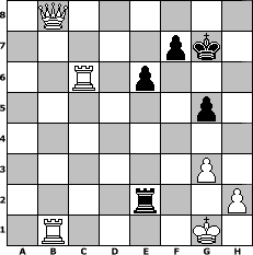 game notation in PGN-format [Event "Novemberturnier"] [Site "www.myChess.de"] [Date "2004.11.04"] [Round "1"] [White "Wormatia08"] [Black "Seneca"] [ECO "B07"] [WhitemyELO "1541"] [BlackmyELO "1528"] [Result "1-0"] [TimeControl "10/2592000"] [WhiteDays "146"] [BlackDays "150"] [MyChessNo "7795"] 1. e4 d6 2. d4 g6 3. Nc3 Bg7 4. Bc4 Nc6 5. Nf3 e6 6. O-O Nge7 7. Be3 O-O 8. Qd2 Kh8 9. Bh6 Rg8 10. Ng5 Qf8 11. Bxg7+ Qxg7 12. Rad1 Nd8 13. f4 Rf8 14. Nb5 a6 15. Nxc7 Ra7 16. Qb4 b5 17. Qxd6 bxc4 18. Qxe7 h6 19. Nf3 Bb7 20. Qc5 Ra8 21. Nxa8 Bxa8 22. e5 Bd5 23. b4 cxb3 24. cxb3 Nb7 25. Qb6 a5 26. Rc1 Rb8 27. Qc7 Qf8 28. Nd2 Kg7 29. Nc4 a4 30. Nb6 Qe8 31. Nxd5 axb3 32. Nf6 Qd8 33. Qxd8 Rxd8 34. axb3 Rxd4 35. Rc7 Nd8 36. g3 g5 37. fxg5 hxg5 38. Rb1 Rb4 39. Rc4 Rb6 40. b4 Nc6 41. Nd7 Rb7 42. Rxc6 Rxd7 43. b5 Rd5 44. b6 Rxe5 45. b7 Re2 46. b8=Q 1-0 position notation in FEN-format 1Q6/5pk1/2R1p3/6p1/8/6P1/4r2P/1R4K1 - - - 0 46 Captured white pieces: Captured black pieces: Click on a captured piece in order to display the desired move!