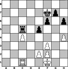game notation in PGN-format [Event "2. Norderstedter DENK MAL Open 2011"] [Site "www.myChess.de"] [Date "2011.06.02"] [Round "1"] [White "Steppenwolf"] [Black "Master1"] [ECO "C57"] [WhitemyELO "1132"] [BlackmyELO "1322"] [Result "1/2-1/2"] [TimeControl "10/2592000"] [WhiteDays "30"] [BlackDays "30"] [MyChessNo "74290"] 1. e4 e5 2. Nf3 Nc6 3. Bc4 Nf6 4. Ng5 d5 5. exd5 Nxd5 6. d3 h6 7. Nf3 Be6 8. O-O Bd6 9. Nbd2 O-O 10. Ne4 Na5 11. Nxd6 Nxc4 12. dxc4 Qxd6 13. cxd5 Bxd5 14. b3 Rad8 15. a4 Bxf3 16. Qxf3 Qd4 17. Be3 Qd5 18. Bxa7 Qxf3 19. gxf3 b6 20. a5 bxa5 21. Rxa5 Ra8 22. Rd1 f6 23. b4 Rf7 24. c4 c6 25. Bc5 Rc8 26. b5 cxb5 27. Rxb5 Rfc7 28. Rc1 Rxc5 29. Rxc5 Rxc5 30. h4 Kf7 31. Kf1 1/2-1/2 position notation in FEN-format 8/5kp1/5p1p/2r1p3/2P4P/5P2/4PP2/2R2K2 - - - 2 31 Captured white pieces: ![]() ![]() ![]() ![]() ![]() ![]() ![]() ![]() ![]() ![]() ![]() ![]() ![]() ![]() ![]() Captured black pieces: ![]() ![]() ![]() ![]() ![]() ![]() ![]() ![]() ![]() ![]() ![]() ![]() ![]() ![]() ![]() Click on a captured piece in order to display the desired move!