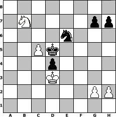 game notation in PGN-format [Event "MNX3"] [Site "www.myChess.de"] [Date "2015.07.25"] [Round "1"] [White "FrankB"] [Black "sprinterde"] [ECO "A40"] [WhitemyELO "1667"] [BlackmyELO "1745"] [Result "0-1"] [TimeControl "10/3456000"] [WhiteDays "37"] [BlackDays "39"] [MyChessNo "99893"] 1. d4 e6 2. Nf3 d5 3. a3 Nf6 4. e3 c5 5. c4 cxd4 6. cxd5 dxe3 7. Bb5+ Bd7 8. Bxd7+ Nbxd7 9. dxe6 exf2+ 10. Kxf2 Bc5+ 11. Ke2 fxe6 12. b4 Be7 13. Bb2 O-O 14. Re1 Nb6 15. Qb3 Qd5 16. Nbd2 Ne4 17. Qxd5 exd5 18. Rac1 Nxd2 19. Nxd2 Bh4 20. Rf1 Rae8+ 21. Kd3 Bg5 22. Rc7 Re7 23. Rxe7 Bxe7 24. Bd4 Rxf1 25. Nxf1 Nc4 26. Bxa7 Nxa3 27. Bc5 Kf7 28. Kd4 Bxc5+ 29. bxc5 Ke6 30. Ne3 Nb5+ 31. Kd3 d4 32. Nc4 Kd5 33. Na5 Nc7 34. Nxb7 Ne6 0-1 position notation in FEN-format 8/1N4pp/4n3/2Pk4/3p4/3K4/6PP/8 - - - 1 35 Captured white pieces: Captured black pieces: Click on a captured piece in order to display the desired move!