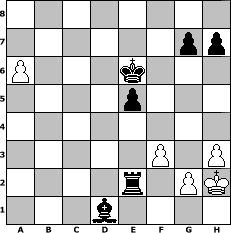 game notation in PGN-format [Event "2013 zum Ersten"] [Site "www.myChess.de"] [Date "2013.01.01"] [Round "1"] [White "Master1"] [Black "Lohl"] [ECO "D00"] [WhitemyELO "1340"] [BlackmyELO "1723"] [Result "0-1"] [TimeControl "10/2592000"] [WhiteDays "108"] [BlackDays "052"] [MyChessNo "85793"] 1. d4 d5 2. e3 Nf6 3. Bd3 e6 4. Nf3 c5 5. c3 Nc6 6. Nbd2 cxd4 7. cxd4 Bd6 8. O-O O-O 9. Qe2 Nb4 10. e4 Nh5 11. e5 Nf4 12. Qe3 Nfxd3 13. exd6 Nxc1 14. Rfxc1 Qxd6 15. a3 Nc6 16. b4 Bd7 17. Ne5 Rac8 18. Nxc6 Bxc6 19. a4 Qxb4 20. Rcb1 Qd6 21. a5 f6 22. Rc1 Bd7 23. Rxc8 Rxc8 24. Nb3 e5 25. dxe5 Qxe5 26. Qxe5 fxe5 27. h3 Kf7 28. f3 Rc2 29. Kh2 d4 30. Rd1 Ba4 31. Nd2 Ra2 32. Rb1 Rxd2 33. Rxb7+ Ke6 34. Rxa7 d3 35. Ra8 Re2 36. a6 d2 37. Rd8 d1=Q 38. Rxd1 Bxd1 0-1 position notation in FEN-format 8/6pp/P3k3/4p3/8/5P1P/4r1PK/3b4 - - - 0 39 Captured white pieces: Captured black pieces: Click on a captured piece in order to display the desired move!