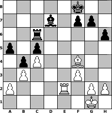 game notation in PGN-format [Event "Mit Sizialisch in den Herbst!"] [Site "www.myChess.de"] [Date "2005.09.22"] [Round "1"] [White "Master1"] [Black "reisinger"] [ECO "B32"] [WhitemyELO "1138"] [BlackmyELO "1456"] [Result "1/2-1/2"] [TimeControl "10/1728000"] [WhiteDays "20"] [BlackDays "20"] [MyChessNo "17705"] 1. e4 c5 2. Nf3 Nc6 3. d4 e6 4. d5 exd5 5. Qxd5 Nf6 6. Qc4 d5 7. exd5 Nxd5 8. Qe4+ Be6 9. Bb5 a6 10. Bxc6+ bxc6 11. Ne5 Qa5+ 12. Bd2 Qb5 13. Nc3 Qb4 14. Qxb4 cxb4 15. Nxd5 Bxd5 16. O-O Bd6 17. Rfe1 O-O 18. Nd7 Rfe8 19. Rxe8+ Rxe8 20. Nb6 Be6 21. b3 c5 22. Re1 h6 23. Nc4 Rd8 24. Nxd6 Rxd6 25. Re2 Kf8 26. f3 a5 27. c4 Bd7 28. Bf4 Rc6 1/2-1/2 position notation in FEN-format 5k2/3b1pp1/2r4p/p1p5/1pP2B2/1P3P2/P3R1PP/6K1 - - - 3 29 Captured white pieces: Captured black pieces: Click on a captured piece in order to display the desired move!