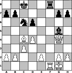 game notation in PGN-format [Event "K"] [Site "www.myChess.de"] [Date "2009.06.03"] [Round "2"] [White "Caligula"] [Black "babikar"] [ECO "C34"] [WhitemyELO "1284"] [BlackmyELO "1303"] [Result "1-0"] [TimeControl "10/2592000"] [WhiteDays "30"] [BlackDays "19"] [MyChessNo "56356"] 1. e4 e5 2. f4 exf4 3. Nf3 d6 4. Bc4 Bg4 5. O-O Qe7 6. Nc3 Nc6 7. Nd5 Qd7 8. c3 O-O-O 9. d4 Re8 10. Bxf4 Rxe4 11. Qd3 Nf6 12. Nxf6 Qf5 13. Qxe4 Qxf6 14. Ng5 Be7 15. Nxf7 Rf8 16. Bg5 Qxf1+ 17. Rxf1 Bxg5 18. Nxd6+ cxd6 19. Qxg4+ 1-0 position notation in FEN-format 2k2r2/pp4pp/2np4/6b1/2BP2Q1/2P5/PP2P1PP/5RK1 - - - 0 19 Captured white pieces: Captured black pieces: Click on a captured piece in order to display the desired move!
