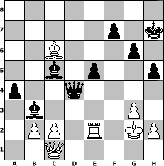 game notation in PGN-format [Event "martinus Open"] [Site "www.myChess.de"] [Date "2010.06.02"] [Round "1"] [White "herieg26928 (adv.)"] [Black "bjeu"] [ECO "A21"] [WhitemyELO "1833"] [BlackmyELO "2017"] [Result "0-1"] [TimeControl "10/1728000"] [WhiteDays "60"] [BlackDays "22"] [MyChessNo "66006"] 1. c4 e5 2. Nc3 g6 3. g3 d6 4. Bg2 Nc6 5. d3 Bg7 6. e4 Nge7 7. Nge2 Nd4 8. O-O Nec6 9. Rb1 a5 10. Nxd4 Nxd4 11. Ne2 Bg4 12. f3 Nxe2+ 13. Qxe2 Be6 14. f4 exf4 15. Bxf4 O-O 16. Be3 a4 17. Qd2 b5 18. cxb5 Bxa2 19. Rbc1 Rb8 20. Qa5 Bb3 21. e5 dxe5 22. Ba7 Bh6 23. Rce1 Qxd3 24. Bxb8 Rxb8 25. Qxc7 Qd4+ 26. Kh1 Rxb5 27. Qe7 Bf8 28. Qe8 Rc5 29. Rd1 Rc8 30. Qxc8 Bxd1 31. Re1 Bb3 32. Qc1 Bb4 33. Re2 h5 34. Bc6 Kh7 35. Kg2 Bc5 0-1 position notation in FEN-format 8/5p1k/2B3p1/2b1p2p/p2q4/1b4P1/1PP1R1KP/2Q5 - - - 4 36 Captured white pieces: Captured black pieces: Click on a captured piece in order to display the desired move!